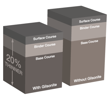 Industry reports of Gilsonite®-modified asphalt lasting more than twice as long as unmodified mixtures are common. In addition, the high modulus provided by Gilsonite® uintaite allows the base and binder courses to be up to 20% thinner while still providing the same level of performance, enabling the use of less material. Gilsonite® can also act as a lower-cost, performance-enhancing extender in a mixture including SBS polymers.