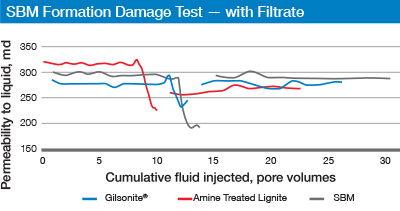 Lab tests show that Gilsonite® uintaite used as a fluid loss control additive in synthetic-based drilling mud (SBM) causes negligible formation damage. Third-party lab testing indicated that mud with Gilsonite® uintaite reduced damage to the hydrocarbon-bearing formation compared to synthetic-based mud alone.