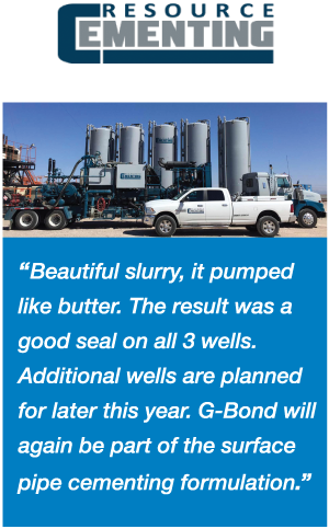 The Operations Support Manager of Resource Cementing stated that using Gilsonite® G-Bond helped create “a beautiful slurry – it pumped like butter. The result was a good seal on all three wells. Additional wells are planned for later this year. G-Bond will again be part of the surface pipe cementing formulation.”